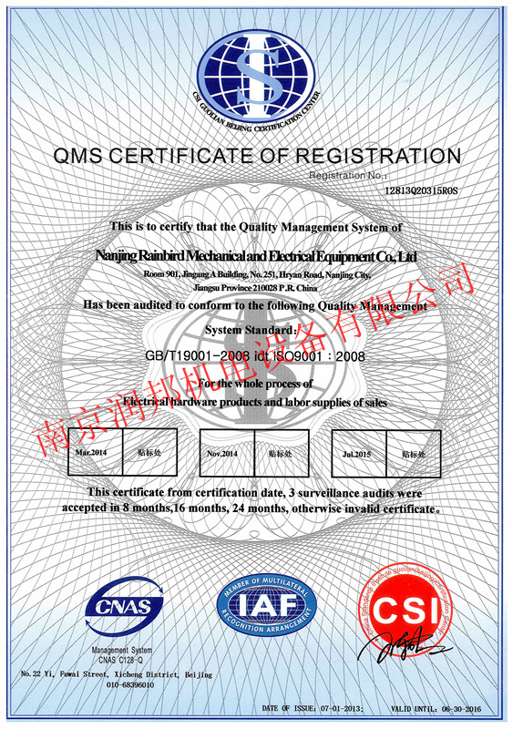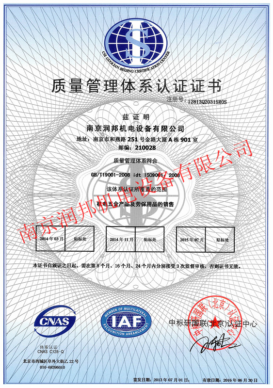 2013年7月1日,我公司順利通過(guò)ISO9001質(zhì)量管理體系認(rèn)證,并獲取以下證書(shū):